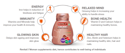 It also improves your health and immunity, delays skin ageing and improves skin glow. Vitamins present in Revital H Woman Tablet plays a vital role in the maintenance of normal vision, immunity & bone health.